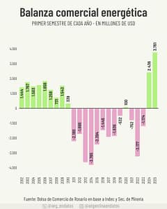 Argentina alcanzó en el primer semestre de 2025 un superávit energético de 3.761 millones de dólares, el mayor en 35 años. El dato refleja un cambio estructural clave: tras más de una década de déficits, el país recuperó su independencia en materia energética gracias a un salto en las exportaciones de petróleo y gas, sumado a una fuerte caída de las importaciones.