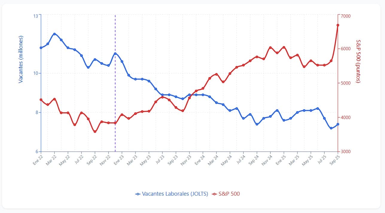 En marzo de 2022, Estados Unidos tenía un récord de 12 millones de vacantes laborales. Para agosto de 2025, ese número cayó a 7,2 millones: una baja del 40%. En el mismo período, el índice bursátil S&P 500 (mide a las empresas más grandes del país) subió de 3.840 a 6.688 puntos, lo que equivale a una ganancia del 74%.