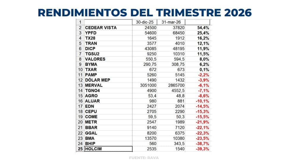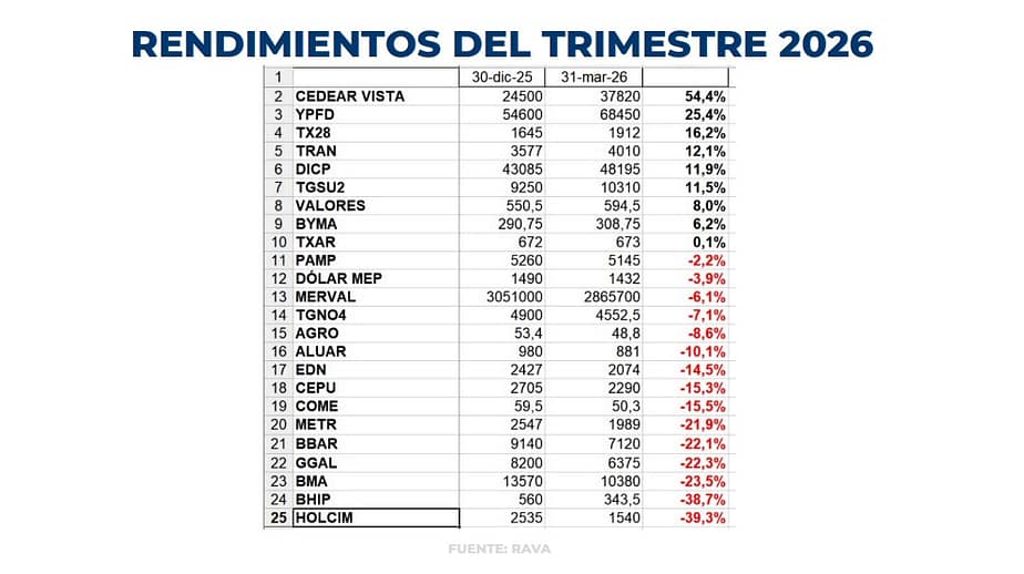 La renta variable local muestra una brecha profunda entre sectores. Según el análisis de Eduardo Fernández (Rava Bursátil), los instrumentos más operados reflejan un trimestre de suma cero para el Merval (-6,1%). El sector energético es el único ganador indiscutido: CEDEAR Vista lidera con un alza del 54,4%, seguido por YPFD con un 25,4%. El alza del petróleo WTI por encima de los USD 100 y el potencial técnico de TGS tras superar techos históricos explican esta dinámica.